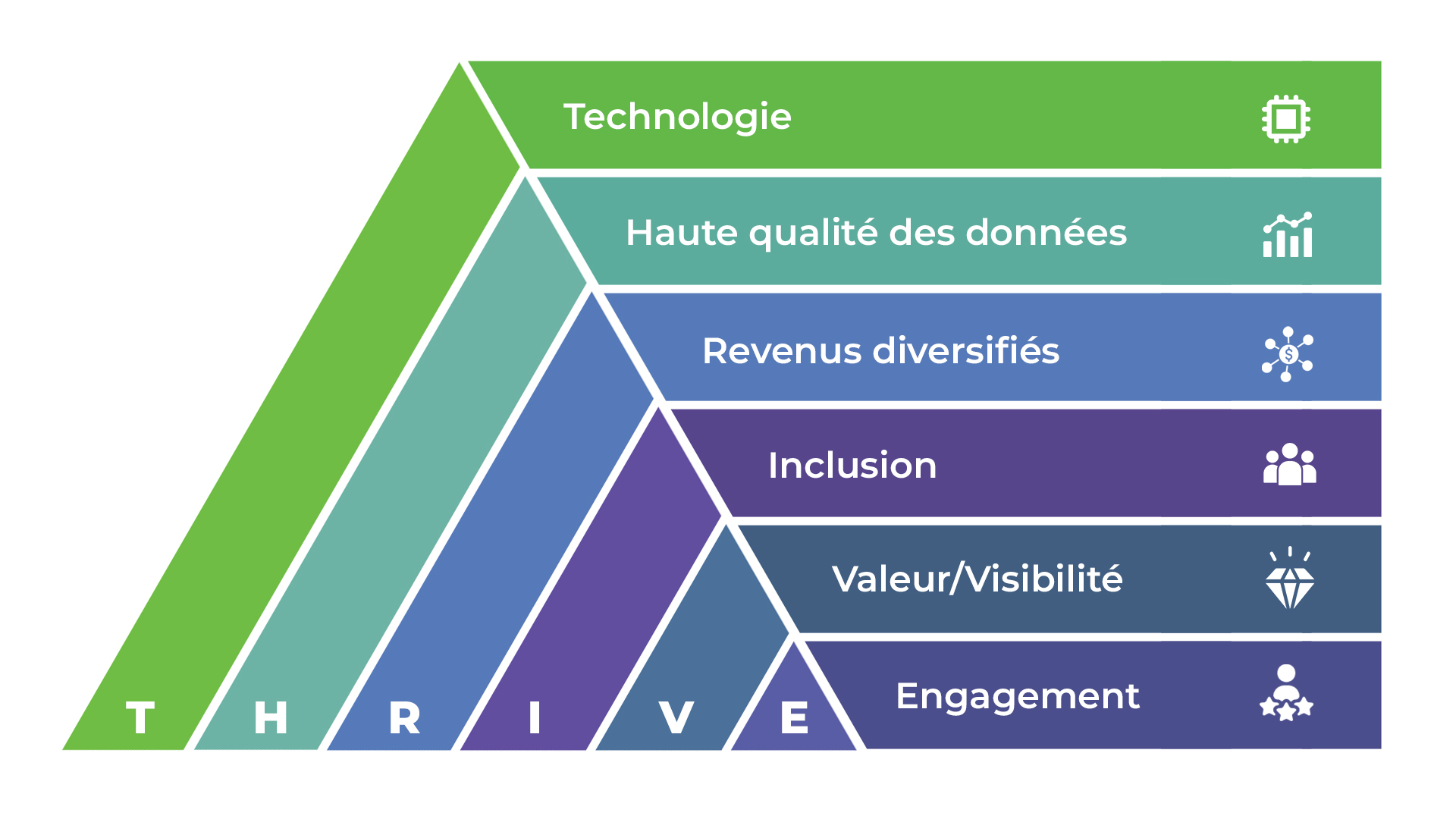 Le modèle de croissance continue THRIVE a été conçu de manière personnalisable pour aider les entreprises à atteindre leurs objectifs. Avec ce modèle, les organisations sont en mesure d’atteindre un succès à long terme, en se concentrant sur six piliers : la technologie, les données, les revenus diversifiés, l’inclusion, la valeur et l’engagement. Chacun de ces aspects est abordé pour identifier les lacunes d’exécution afin qu’une entreprise puisse passer de la stagnation à la prospérité.